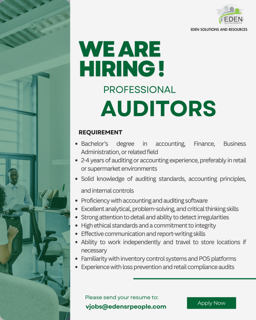 Our client is looking for Professional Auditors to ensure compliance, strengthen controls, and deliver excellence