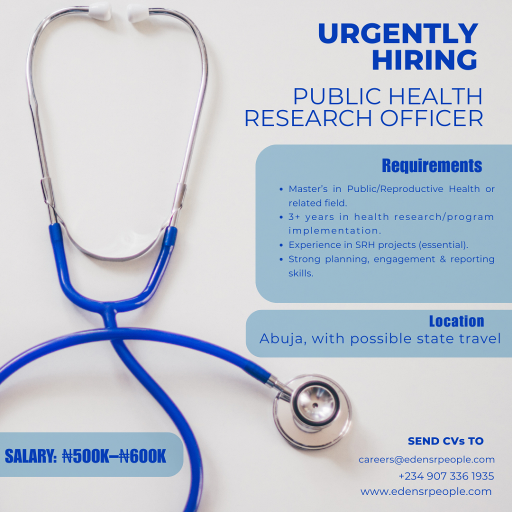 Our client, a leading organization in the healthcare sector, is seeking a Public Health Research Officer to support research, data analysis, and program development in Abuja (with possible state travel).