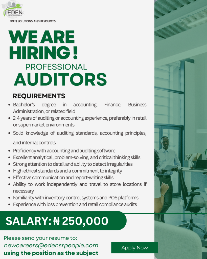• 2-4 years of auditing or accounting experience, preferably in retail or supermarket environments